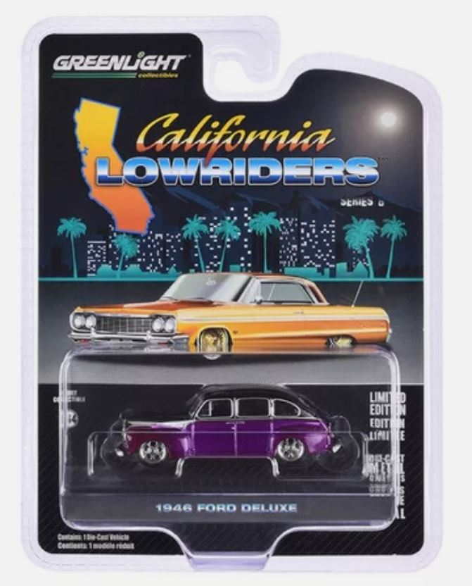 FORD Deluxe 1946 paars uit de CALIFORNIA LOWRIDERS serie in blisterverpakking