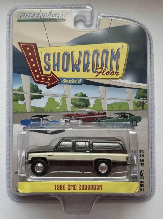 GMC Suburban 1986 bruin en beige uit de SHOWROOM FLOOR serie in blisterverpakking