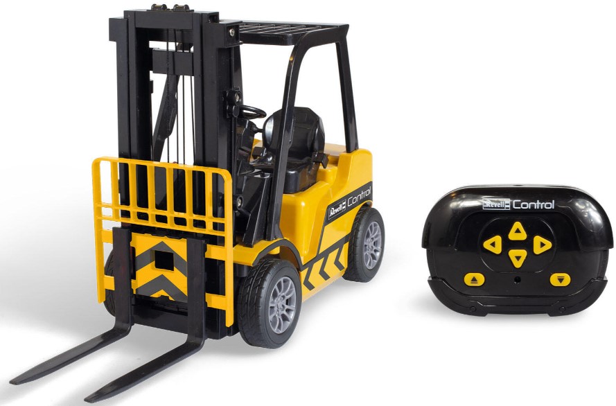Op afstand bediende vorkheftruck met twee kisten en twee pallets en een rek