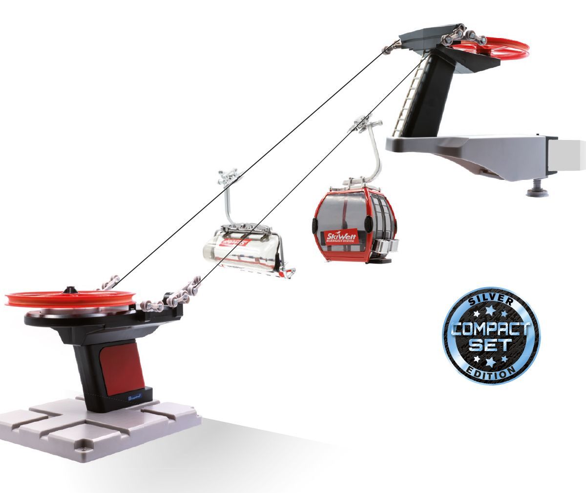 Skilift met 1 stoeltjeslift en 1 gondellift in zwart en rood