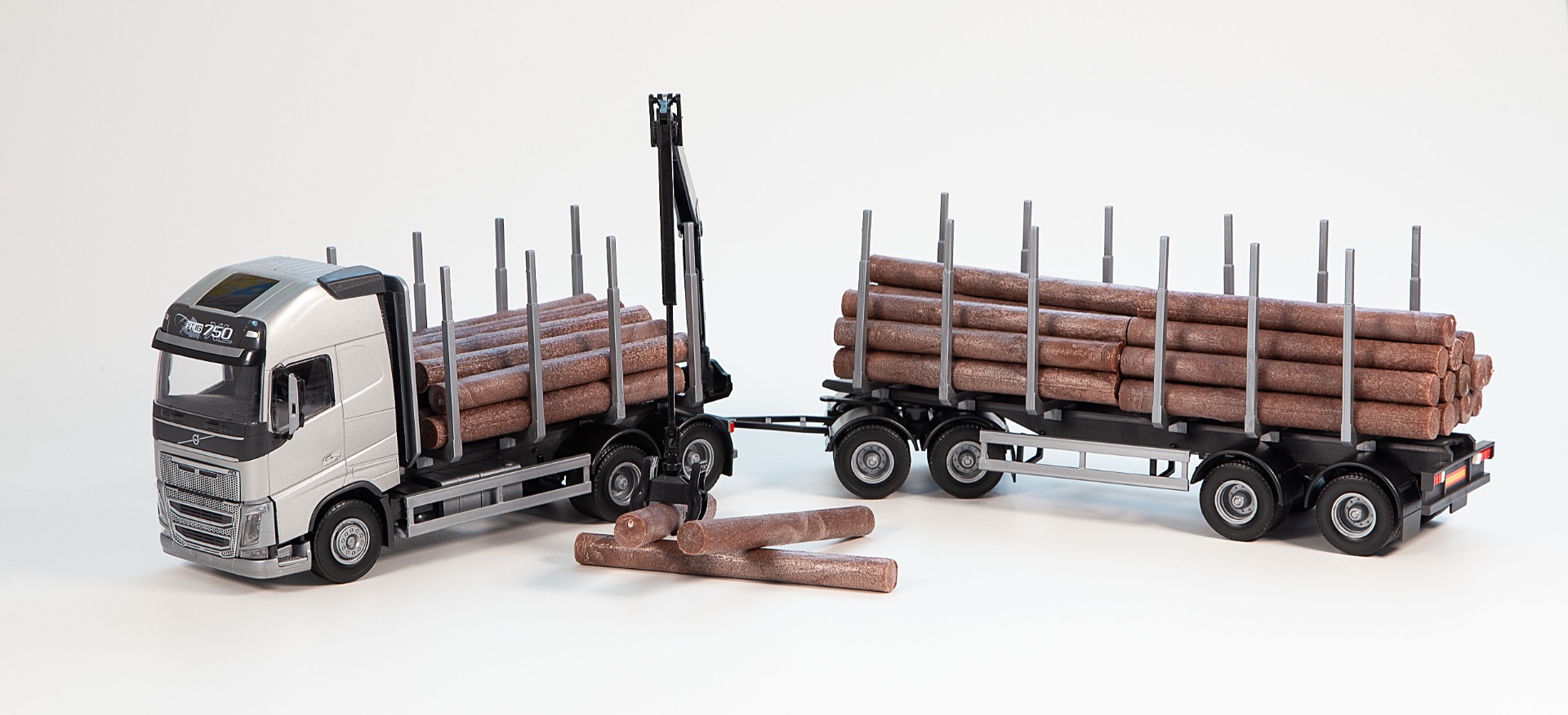 VOLVO FH16 6x4 grijze bakwagen met 2+2 assen houttransportaanhanger